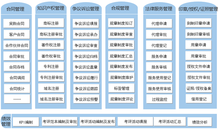 法律服務管理模塊。1、聘請律師事務所、知識產權代理機構等的申請、審批、登記。使用供應商管理模塊)2、使用外部專業(yè)服務的申請、審批、服務內容登記、登記時間和費用、評價。3、使用內部專業(yè)服務的申請、審批、服務內容和法律意見、工作時間記錄等。(希望與工作日志、績效模塊相銜接)4、在系統(tǒng)中實現(xiàn)對法律服務登記、審批、提供等工作的自動流轉、數(shù)據關聯(lián)、信息檢索、統(tǒng)計分析、過程監(jiān)控、預警警示等功能。