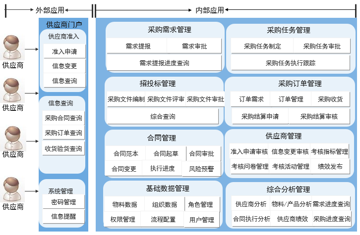 面向大型國企、央企類用戶,復雜線上線下采購管理流程信息化的應用平臺。